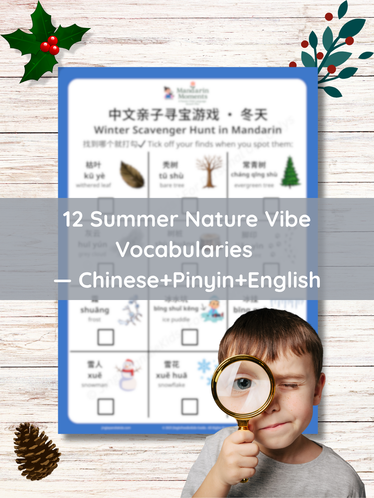 This printable Mandarin scavenger hunt toolkit helps families connect Chinese language with winter landscape and sounds. With 12 carefully chosen vocabulary words, it invites children and parents to slow down, observe, and speak in Mandarin about what they notice — from ice puddles to tree stumps and frost.