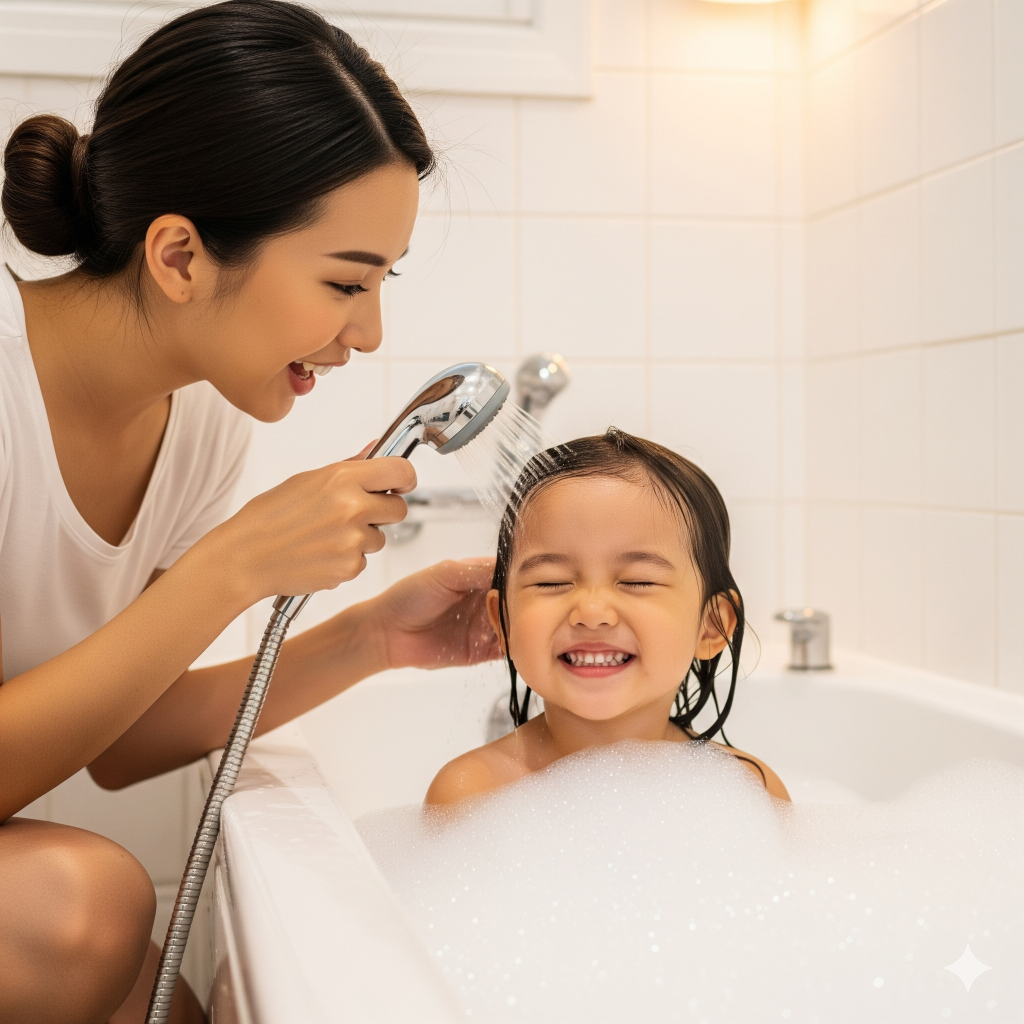 Bonding time: Bathtime is a moment of closeness, and language tied to love and routine sticks best.