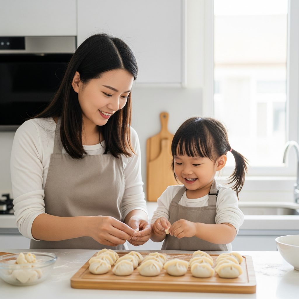 During Chinese New Year, I prepare dumplings with my child. As we press the dough together, I say in Mandarin: